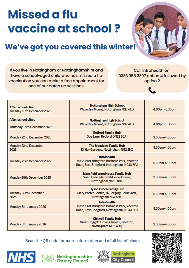 If you live in Nottingham or Nottinghamshire and have a school aged child who has missed a flu vaccine you can make a free appointment in one of the catch up clinics listed below.